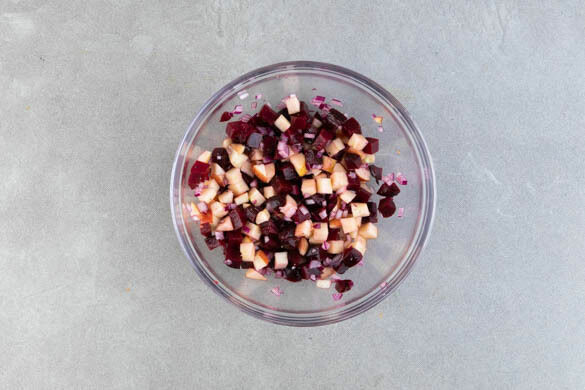 Den Apfel, die Rote Bete und die 1/2 der Zwiebeln mit 2–3EL Olivenöl, der 1/2 des Zitronensafts sowie Salz und Pfeffer nach Geschmack vermengen.
