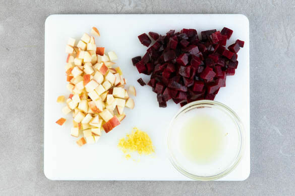Die Äpfel vierteln, entkernen und in ca. 1cm kleine Würfel schneiden. Die Rote Bete vierteln und ebenfalls in ca. 1cm kleine Würfel schneiden. Die Zitronenschale abreiben, dann die Zitrone halbieren und auspressen.