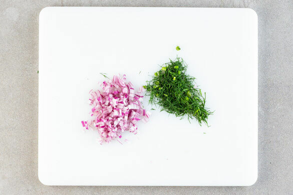 Die Zwiebel schälen, halbieren und in feine Würfel schneiden. Den Dill samt Stängeln fein schneiden.