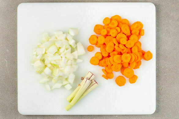 Die Zwiebeln schälen, halbieren und grob würfeln. Die Karotten ggf. schälen und in dünne Scheiben schneiden. Die oberen 3cm des Zitronengrases entfernen, dann das übrige Zitronengras quer halbieren und mit einer schweren Pfanne flach klopfen.