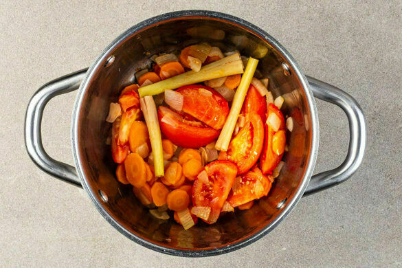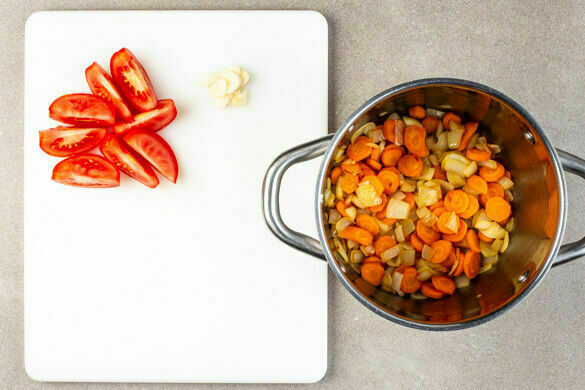 Die Zwiebeln und die Karotten in einem großen Topf mit 2EL Pflanzenöl bei mittlerer Hitze ca. 4Min. weich braten. Den Knoblauch schälen und in feine Scheibchen schneiden. Die Tomaten in Spalten schneiden.