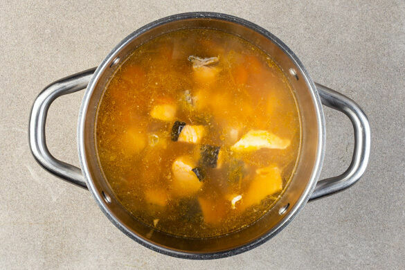 Den Fisch mit kaltem Wasser abspülen, trocken tupfen und evtl. vorhandene Gräten mit einer Pinzette entfernen. Den Fisch auf beiden Seiten mit je 1 Prise Salz und Pfeffer würzen, in ca. 2cm große Würfel schneiden und in die Suppe geben. Den Fisch bei niedriger Hitze 8–10Min. sanft gar köcheln lassen.