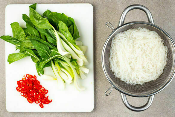 In einem Wasserkocher ausreichend Wasser für die Nudeln zum Kochen bringen. Die Nudeln mit heißem Wasser bedecken und 3–5Min. ziehen lassen. In ein Sieb abgießen, kalt abschrecken und abtropfen lassen. Den Pak Choi längs in dünne Streifen schneiden. Die Peperoni in feine Ringe schneiden. Tipp: Für weniger Schärfe die Kerne entfernen.