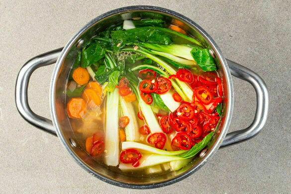 Das Zitronengras entfernen. Den Pak Choi und die Peperoni in die Suppe geben und ca. 2Min. mitköcheln, dann mit Pfeffer abschmecken. Die Nudeln und die Suppe auf tiefe Teller oder Schalen verteilen und servieren.