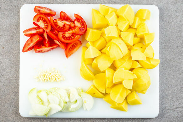 In einem großen Topf ausreichend gesalzenes Wasser für die Kartoffeln zum Kochen bringen. Die Kartoffeln schälen und grob würfeln. Die Zwiebel schälen, halbieren und in dünne Streifen schneiden. Den Knoblauch schälen und fein würfeln. Die Tomaten in dünne Spalten schneiden.