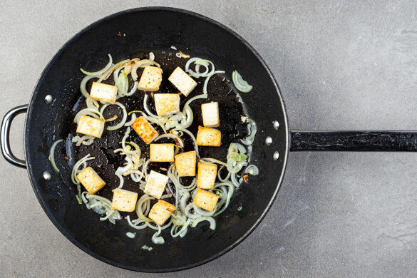 Den Tofu und die Zwiebeln in einer großen Pfanne mit 2EL Pflanzenöl bei mittlerer Hitze ca. 5Min. unter gelegentlichem Rühren braten, bis der Tofu rundum appetitlich gebräunt ist und die Zwiebeln weich sind.