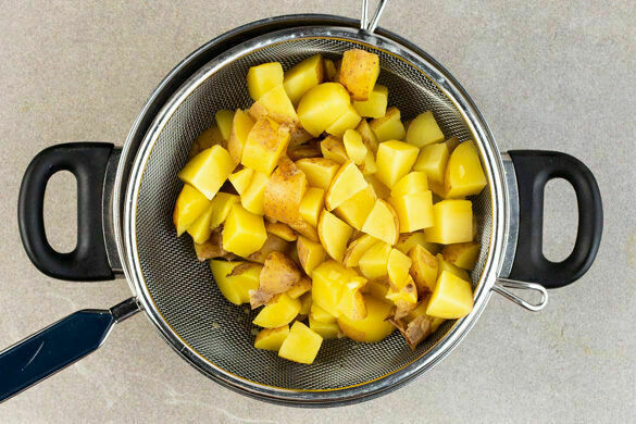 In einem großen Topf ausreichend gesalzenes Wasser für die Kartoffeln zum Kochen bringen. Die Kartoffeln samt Schale in ca. 1cm große Würfel schneiden, dann in das kochende Wasser geben und bei starker Hitze in 10–12Min. bissfest kochen. In ein Sieb abgießen und abtropfen lassen.
