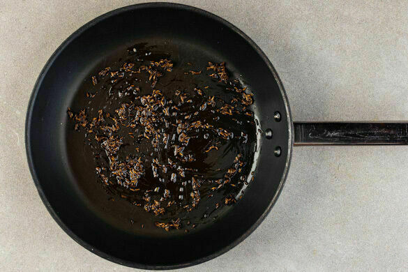 Den Kreuzkümmel in einer zweiten großen Pfanne mit 1EL Pflanzenöl bei mittlerer Hitze 30–40Sek. anbraten. Vorsicht, die Samen können schnell zu dunkel werden. Den Kreuzkümmel samt Öl aus der Pfanne nehmen und beiseitestellen.