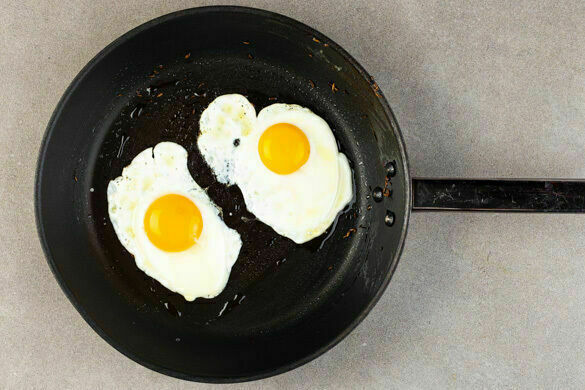 In derselben Pfanne 1EL Pflanzenöl bei mittlerer Hitze erwärmen. Die Eier aufbrechen, in die Pfanne gleiten lassen und in 3–4Min. zu Spiegeleiern braten. Mit Salz und Pfeffer würzen und aus der Pfanne nehmen. Tipp: Wer möchte, dass auch das Eigelb fest wird, verwendet einen Deckel.