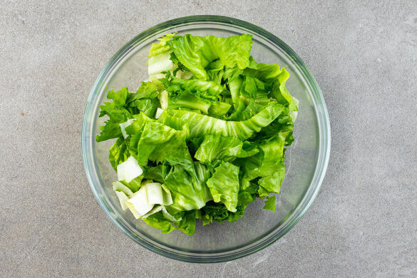Die 1/2 der Endivie in mundgerechte Stücke schneiden und mit 1EL Essig vermengen. Die übrige Endivie wird für dieses Rezept nicht benötigt.
