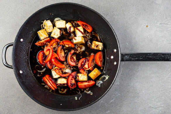 Den Knoblauch und 1/2TL Mehl unterrühren und ca. 1Min. mitbraten, dann die Tomaten, das Ketjap Manis, die BBQ-Sauce, 1 Prise Salz und 50ml Wasser dazugeben und 5–6Min. köcheln lassen, bis die Tomaten gar sind und eine dickflüssige Sauce entstanden ist. Die Pfanne vom Herd nehmen.