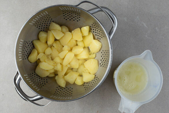 Die Kartoffeln in das kochende Wasser geben und in 12–15Min. bissfest kochen. Mit einem Messbecher ca. 100ml Kochwasser abschöpfen, dann die Kartoffeln in einem Sieb abtropfen lassen und zurück in den Topf geben.
