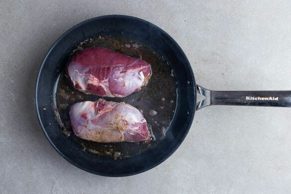 Das Fleisch trocken tupfen, die Hautseite einige Male kreuzweise einschneiden und jeweils mit 1 kräftigen Prise Salz würzen. Das Fleisch mit der Hautseite nach unten in eine große, kalte Pfanne geben und bei niedriger bis mittlerer Hitze 10–12Min. anbraten, bis das Fett ausgelassen und die Haut goldbraun und knusprig ist. Tipp: Die Hitze nicht erhöhen, damit das Fett langsam brät.