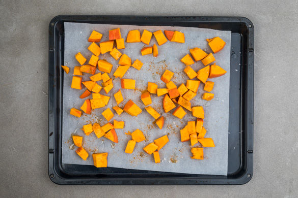 Den Backofen auf 180°C Umluft (200°C Ober-/Unterhitze) vorheizen. Die Kürbiskerne mit einem Löffel entfernen, dann 400g Kürbis abwiegen und in ca. 2cm große Würfel schneiden. Auf einem mit Backpapier ausgelegten Backblech mit 1–2EL Pflanzenöl, Salz und 1–2TL Gewürzmischung vermengen. Gleichmäßig auf dem Blech verteilen und ca. 20Min. im Ofen backen.