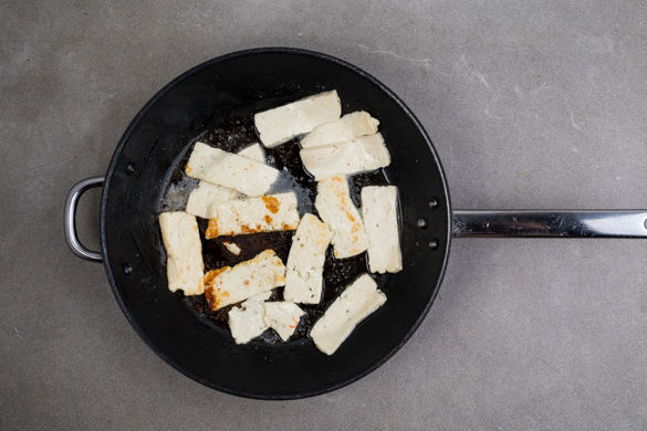 Den Halloumi in ca. 0,5cm dicke Scheiben schneiden und in einer großen Pfanne mit ca. 1–2EL Öl bei mittlerer Hitze von jeder Seite ca. 2Min. knusprig-braun anbraten. Anschließend aus der Pfanne nehmen und warm halten.