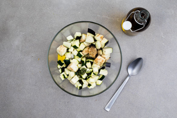 Den Strunk der Aubergine und die Enden der Zucchini abschneiden, die Paprika halbieren und entkernen. Alles in ca. 2–3cm große Würfel schneiden.