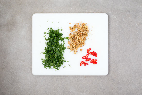 Die Walnüsse grob hacken und in einer kleinen Pfanne ohne Zugabe von Fett bei mittlerer Hitze leicht anrösten. Vorsicht, die Nüsse können schnell verbrennen. Die Petersilie samt Stängeln fein hacken. Die Peperoni schräg in dünne Ringe schneiden.