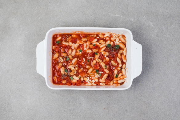 Den Backofen auf 220°C Umluft (240°C Ober-/Unterhitze) vorheizen. Den Knoblauch schälen und fein hacken. Die Oreganoblätter von den Stängeln zupfen und ggf. fein hacken. Die Bohnen in ein Sieb abgießen und abspülen. Die gehackten Tomaten, den Knoblauch, den Oregano und die Bohnen in eine Auflaufform geben, gut verrühren und mit Salz und Pfeffer würzen.