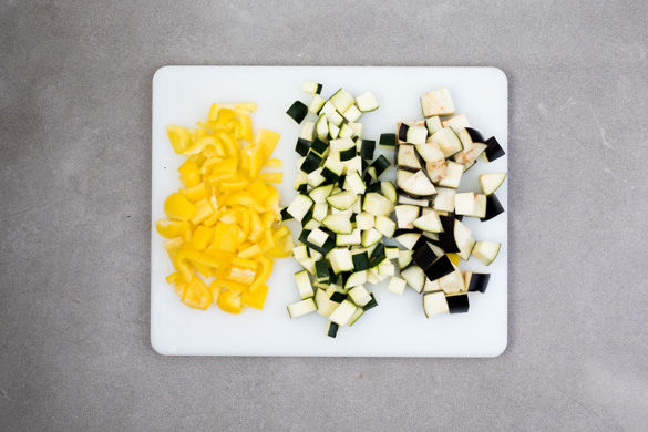 Den Strunk der Aubergine und die Enden der Zucchini abschneiden, die Paprika halbieren und entkernen. Alles in ca. 2–3cm große Würfel schneiden.