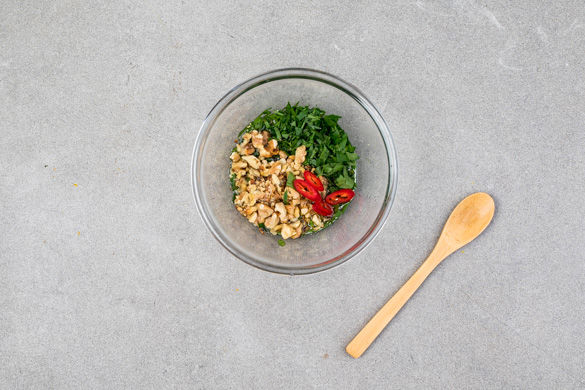 Die Walnüsse und die Petersilie mit 1EL Olivenöl, 1–2TL Essig und 1 Prise Salz zu einem Dressing verrühren. Je nach gewünschter Schärfe Peperoni hinzugeben und nochmals gut verrühren.