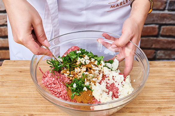 Inzwischen die Petersilienblätter von den Stängel zupfen und fein hacken. Das Hackfleisch mit den restlichen Zwiebeln, dem Knoblauch, ca. 5–6 gehäuften EL Couscous, der 1/2 der Petersilie und der Gewürzmischung verkneten. Mit Salz und Pfeffer abschmecken und aus der Masse ca. 15–18 Hackklößchen formen.
