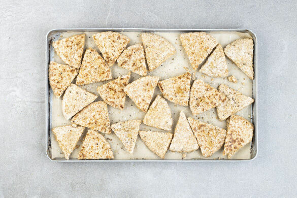 Das Pitabrot in Dreiecke schneiden und auf einem oder zwei mit Backpapier ausgelegten Backblechen verteilen. Mit 2EL Olivenöl beträufeln und 4–6Min. im Ofen knusprig aufbacken.
