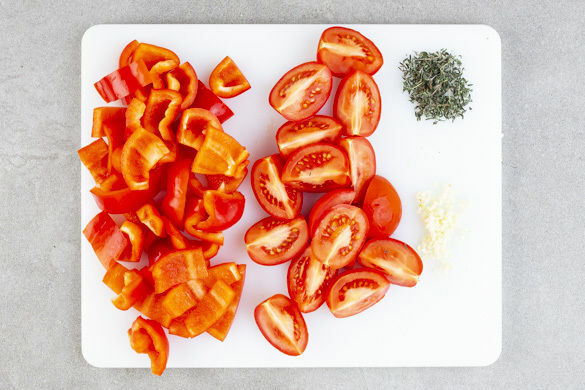 Den Backofen auf 220°C (200°C Umluft) vorheizen. Die Paprika vierteln, entkernen und in grobe Stücke schneiden. Die Tomaten in Spalten schneiden, den Knoblauch schälen und fein würfeln. Die Thymianblättchen von den Stängeln streifen.