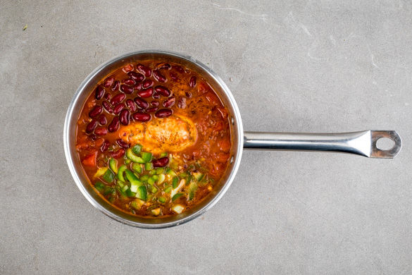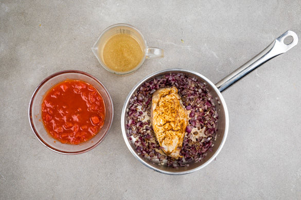 Die Zwiebeln in einem großen Topf mit 1EL Pflanzenöl bei mittlerer Hitze 1–2Min. glasig anbraten. Den Knoblauch hinzugeben und ca. 1Min. mitbraten. Das Hähnchen dazugeben und ca. 2–3Min. anbraten. Die gehackten Tomaten und die Brühe so über das Fleisch geben, dass es bedeckt ist, und alles für 15–20Min. köcheln lassen.