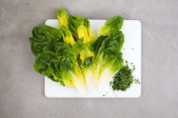 Den Salat in einzelne Blätter zerteilen. Den Koriander samt Stängeln grob hacken.