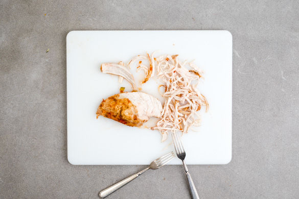 Das Hähnchen aus dem Topf nehmen und die Fleischfasern mit zwei Gabeln auseinanderziehen, größere Fasern ggf. mit einem Messer trennen. Das Fleisch zur Sauce geben und erneut mit Kreuzkümmel, Salz und Pfeffer abschmecken.