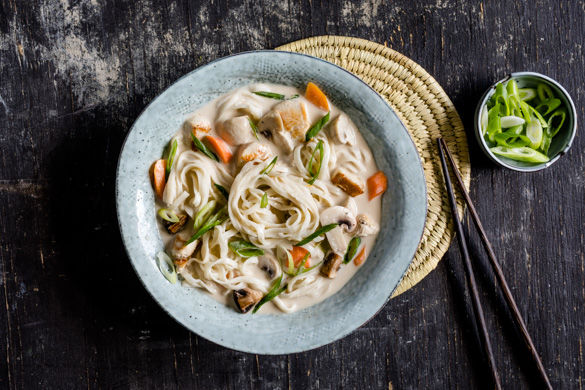 Das Hähnchen in einem mittelgroßen Topf mit 1–2EL Pflanzenöl ca. 2–3Min. scharf anbraten und mit Salz und Pfeffer würzen. Die Pilze, die Karotten, die Erdnussbutter und den Brühwürfel dazugeben und mit der Kokosmilch und 150ml Wasser ablöschen. Die Suppe ca. 8–10Min. auf niedriger bis mittlerer Hitze sanft köcheln lassen, bis die Karotten gar sind.