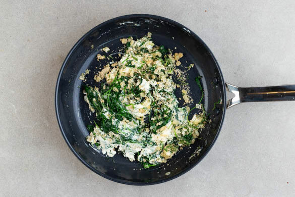 Den Dill samt Stängeln fein schneiden. Den Käse grob reiben. Den Spinat zu den Zwiebeln geben und mit ½TL Salz sowie Pfeffer nach Geschmack würzen. Den Spinat zusammenfallen lassen, dann die Semmelbrösel, die Crème fraîche, den Käse und den Dill unterrühren. Vom Herd nehmen und beiseitestellen.