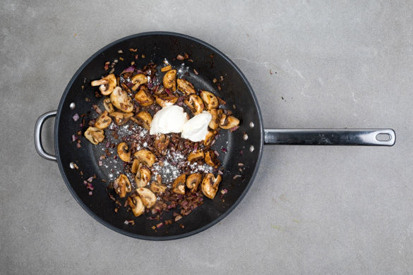 Die Champignons in der Pfanne mit 1EL Pflanzenöl bei mittlerer bis starker Hitze ca. 5Min. scharf anbraten. Die Zwiebeln und die Steinpilze dazugeben und bei mittlerer Hitze ca. 1–2Min. mitbraten. Alles mit 1EL Mehl bestäuben und verrühren. Die Crème fraîche einrühren und ca. 5Min. einkochen lassen, bis eine cremige Sauce entsteht.
