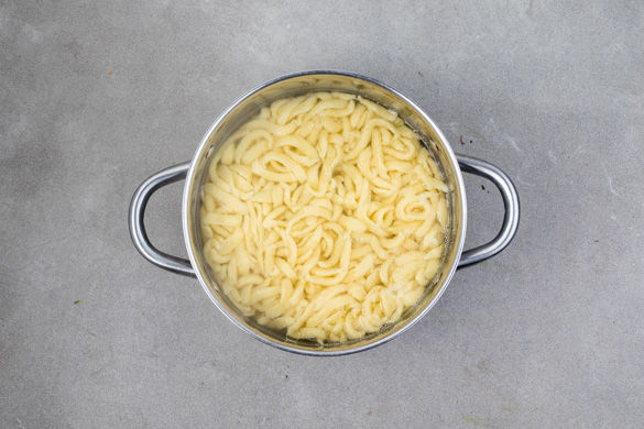 Die Spätzle in das kochende Wasser geben und in ca. 3–5Min. bissfest kochen. In ein Sieb abgießen und abtropfen lassen.