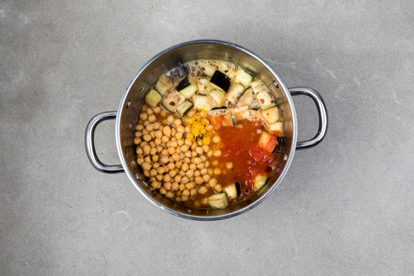 Die Zwiebeln, den Knoblauch und 1TL Harissapulver In einem mittelgroßen Topf mit 1EL Olivenöl bei mittlerer Hitze 1–2 Min. anschwitzen. Die Auberginen dazugeben und ca. 1Min. mitgaren. Die Tomaten, die Kichererbsen, die Aprikosen, die Brühe, 1/2TL Orangenabrieb und die 1/2 des Orangensaftes hinzugeben und 15Min. abgedeckt auf niedriger Stufe köcheln lassen.
