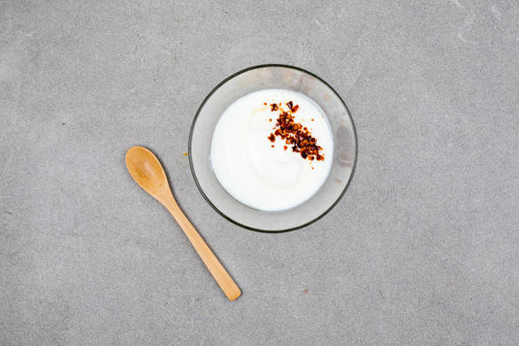 Den Joghurt mit 1 Prise Salz verrühren und mit dem restlichen Harissapulver abschmecken.