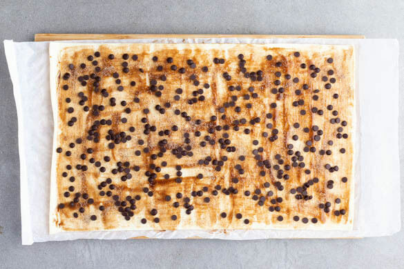 Den Teig mit dem Papier nach unten ausrollen. Gleichmäßig mit der Zimtbutter bestreichen, dann mit dem Vanillezucker und den Schokodrops bestreuen.