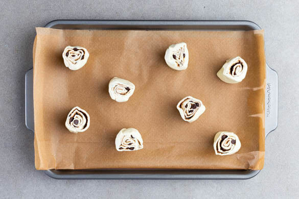 Den Teig von der langen Seite aufrollen, sodass eine lange, zigarrenförmige Rolle entsteht. Die Teigrolle in 8 gleich große, schneckenförmige Scheiben schneiden. Die Teigschnecken mit der Schnittfläche nach oben im gleichmäßigen Abstand auf ein mit Backpapier ausgelegtes Backblech geben.