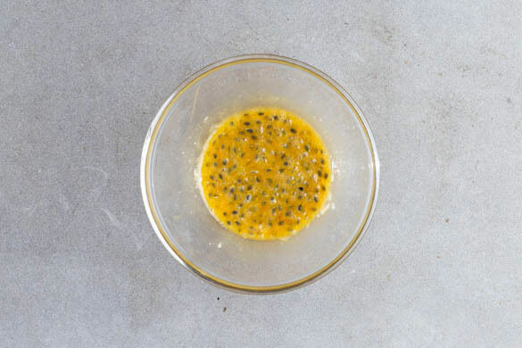 Die Passionsfrüchte halbieren und das Fruchtfleisch samt Kernen aus den Hälften löffeln.