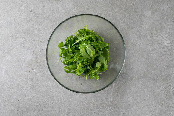 Den Rucola mit 2EL Olivenöl, 2TL hellem Essig sowie je 1 Prise Salz und Pfeffer mischen. Den Stamppot mit den Kirschtomaten anrichten und mit den Pinienkernen und dem restlichen Käse garniert servieren. Den Rucolasalat dazu reichen.