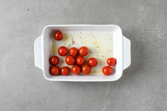 Die Kirschtomaten mit 2EL Olivenöl sowie je 1 kräftigen Prise Salz und Pfeffer in einer Auflaufform würzen und 10–12Min. im Ofen rösten, bis die Schale aufplatzt.