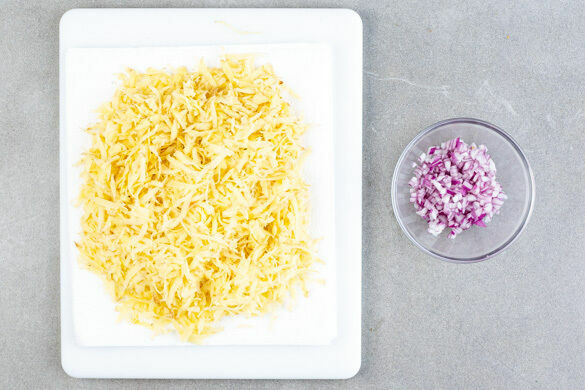 Den Backofen auf 220°C (200°C Umluft) vorheizen. Die Kartoffeln ggf. schälen, mit einer Küchenreibe oder Küchenmaschine grob reiben und in einem Sieb gründlich mit kaltem Wasser abspülen, um möglichst viel Stärke zu entfernen. Anschließend in einem sauberen Küchentuch möglichst gut trocken wringen. Die Zwiebel schälen und fein würfeln.