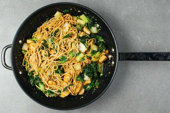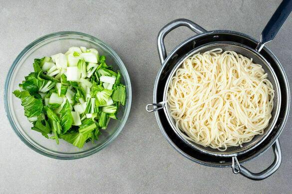 Die Nudeln in das kochende Wasser geben und in ca. 4Min. bissfest kochen. Mit einer Tasse etwas Kochwasser abschöpfen, dann die Nudeln in Sieb abgießen, kalt abschrecken und abtropfen lassen. Den Pak Choi vom Strunk befreien, längs halbieren und in 1–2cm große Stücke schneiden.