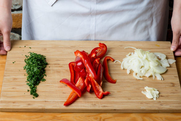 In einem mittelgroßen Topf 300ml leicht gesalzenes Wasser zum Kochen bringen. Die Paprika halbieren, entkernen und in dünne, lange Streifen schneiden. Die Zwiebel schälen, halbieren und in dünne Halbringe schneiden. Den Knoblauch schälen und in dünne Scheibchen schneiden. Die Petersilienblätter von den Stängeln zupfen und fein hacken.