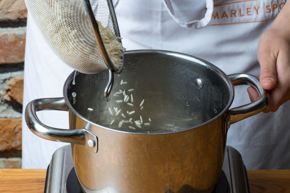 3/4 vom Reis in einem Sieb unter fließendem Wasser abspülen, bis das Wasser klar bleibt. Den Reis ins kochende Wasser geben und bei niedrigster Hitze abgedeckt ca. 10–12Min. kochen, bis das Wasser aufgesogen und der Reis bissfest ist. Noch ca. 5Min. ohne Hitzezufuhr abgedeckt ziehen lassen. Bei sehr großem Hunger den gesamten Reis mit 400ml Wasser verwenden.