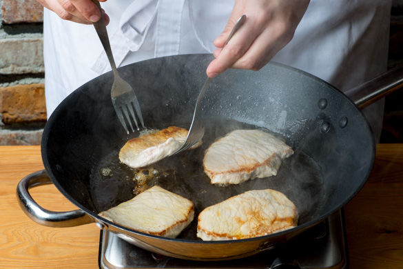 Die Schnitzel ggf. mit einem Fleischklopfer oder einer schweren Pfanne auf ca. 1cm Dicke flach klopfen, falls das Fleisch ungleichmäßig dick ist.