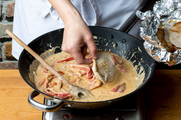 Die Zwiebeln, den Knoblauch und die Paprika in derselben Pfanne mit etwas Salz ca. 2–3Min. anbraten. Mit 1EL Mehl bestäuben, die Hitze leicht reduzieren und mit Milch ablöschen. Den Brühwürfel und 1EL Gewürzmischung dazugeben und ca. 10Min. köcheln lassen. Die Crème fraîche unterrühren und die Sauce mit Salz und Pfeffer abschmecken.