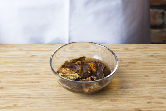 In einem mittelgroßen Topf ausreichend leicht gesalzenes Wasser für die Pasta zum Kochen bringen. Die Steinpilze in 100ml heißem Wasser ca. 5–8Min. einweichen lassen.
