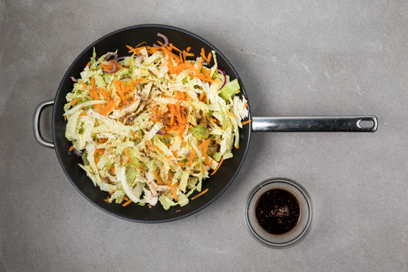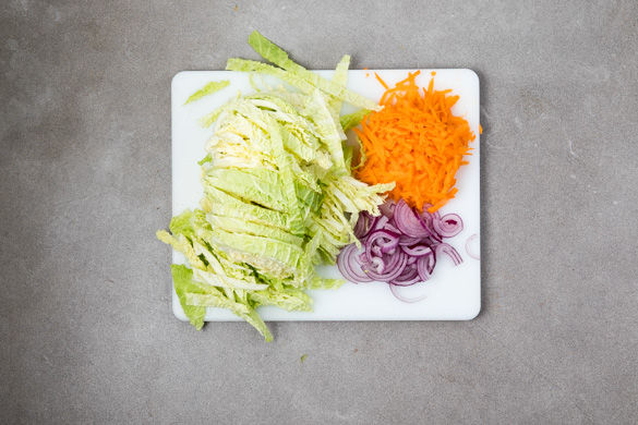 Den Backofen auf 230°C Umluft (250°C Ober-/Unterhitze) vorheizen. Die Zwiebel schälen, halbieren und in feine Halbringe schneiden. Die äußeren Blätter des Wirsings entfernen, den Strunk entfernen und den Kohl in ca. 1cm breite Streifen schneiden. Die Karotten schälen und grob reiben.