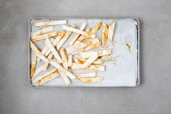 Die Selleriestifte mit ca. 1EL Teriyakisauce vermengen und auf einem mit Backpapier ausgelegten Backblech verteilen. Dabei etwas Platz für das Hähnchen lassen, das später dazukommt. Die Selleriestifte im Ofen ca. 10–15Min. knusprig backen. Das Hähnchen mit etwas Küchenkrepp trocken tupfen und von beiden Seiten mit Salz und Pfeffer würzen.
